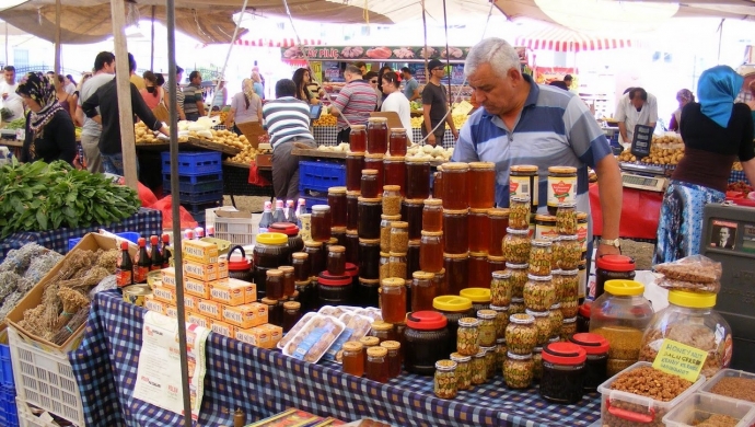 Местные жители города предпочитают покупать еженедельные свежие продукты на базарах, которые проводятся в каждом регионе Анталии в определенный день каждой недели . Эти рынки организованы муниципалитетом Анталии и расположены в специально оборудованных для этого крытых дворах, в которых продаются овощи, фрукты, сыр, рыба, даже легкая одежда, предметы домашнего обихода и цветы. Продовольственные товары там свежие и дешевле, чем в магазинах. На рынке представлены торговцы, фермеры и сельские жители, которые привозят свои товары из различных деревень, окружающих город Анталия